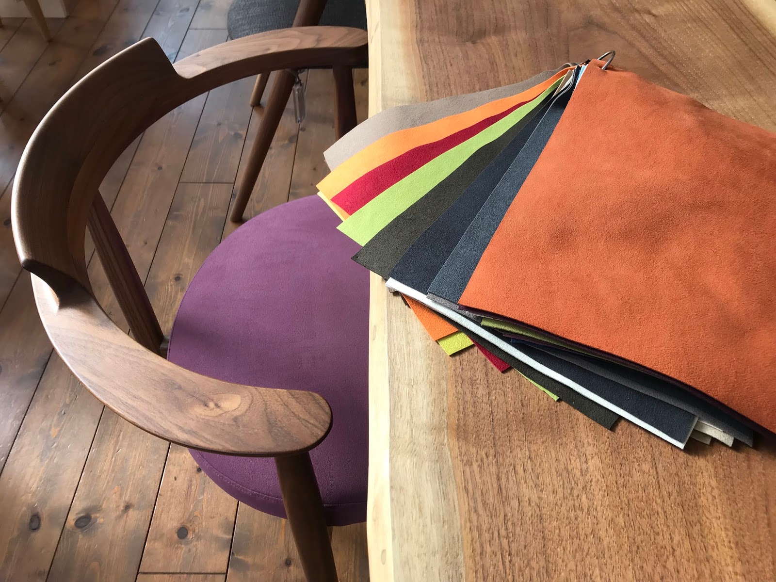2020.1.12 CATEGORY: スタッフ通信 日下です。 家具は何を購入するか決まり、どこに置くかも決まり、最後に迷うのが『色』ですね。新築やリフォーム、お引越しのお客様は、だいたい家の中の建具や床の色、カーテンの色は、決めてからお越しになることが多いです。その色を伺って椅子の色選びにとりかかります。 当店でご購入されるお客様は、4-6脚全て同じ色に揃える方は少なく、2色使いでお選びになる方がとても多いです。 こちらは2種類の椅子に、同色を濃藍色を張りました。 壁に飾ったマリメッコの黄色のファブリックパネルと補色の関係でまとめられました。 2種類の椅子に同色の張り地 2色使いはお好きな色の組み合わせができます。オーダーならではですね。 こちらは同種の椅子に、オレンジと若草色の組み合わせ。 2色使い 緋色(ひいろ)と消し炭色の組み合わせはシックな雰囲気に。 2色の組合せは人気です 左より 明るめな色調の人参色と若草色、暗めな色調のオレンジと松葉色 家の中にあまり色のない場合は、座面の色で楽しめます。 こちらは同種椅子2色 水色と白茶色 同種椅子1色 白の3色の組み合わせ。3色使いも意外と面白いんです。お互いの色を引き立て合う補色の組み合わせ。色調は合わせると色同士が喧嘩しません 3色の組合わせ 2種の椅子を互い違いに置いて、4色の組み合わせ。家族がそれぞれ好きな色に座ったり、その日の気分で好きな色に座ったりできますね。 遊び心のある4色選び 4色の組み合わせもバランスよく選ぶと調和します 調和のとれた4色 お決まりのカーテンの見本や床の色見本などがあれば、お持ちいただくと色決めしやすいです。 色に困ったときはご提案もさせていただきます。 色選びは楽しいですね。ラムースは34色ご用意しています。お好みの色が見つかりますように。